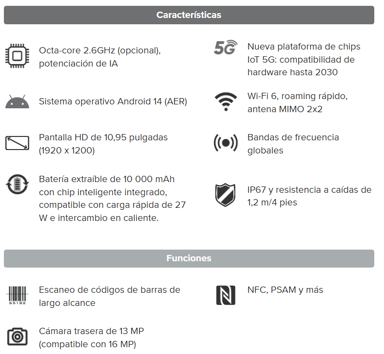| Teclado | 1 tecla de escaneo, tecla de encendido, 2 teclas de volumen (+/-), 2 teclas virtuales |